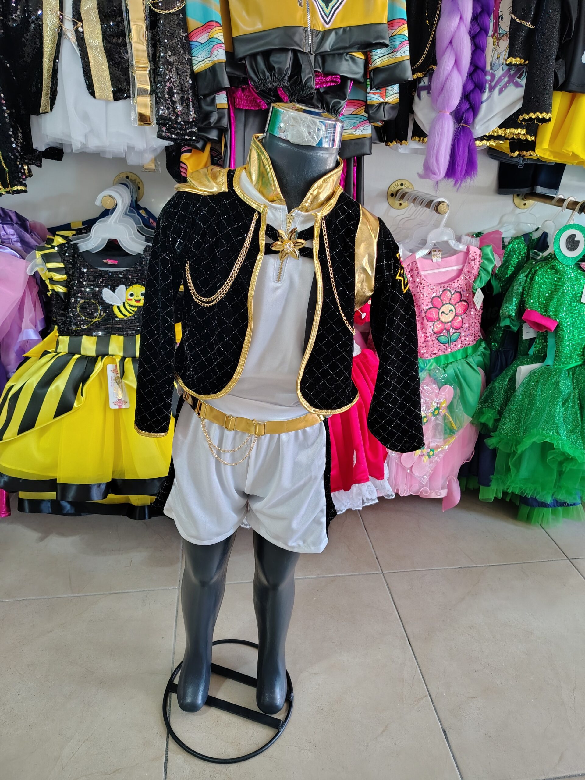 Luce espectacular con este conjunto infantil inspirado en el estilo de las grandes estrellas del escenario. El diseño incluye una prenda tipo short brillante combinada con una elegante chaqueta con detalles dorados que aportan un toque moderno y sofisticado.
