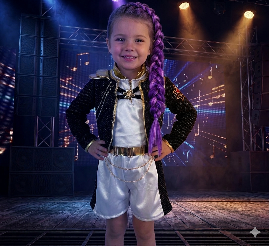 Ideal para presentaciones escolares, festivales, fiestas temáticas o sesiones de fotos, este conjunto permite que las niñas se sientan seguras y listas para brillar mientras cantan, bailan y disfrutan cada momento.