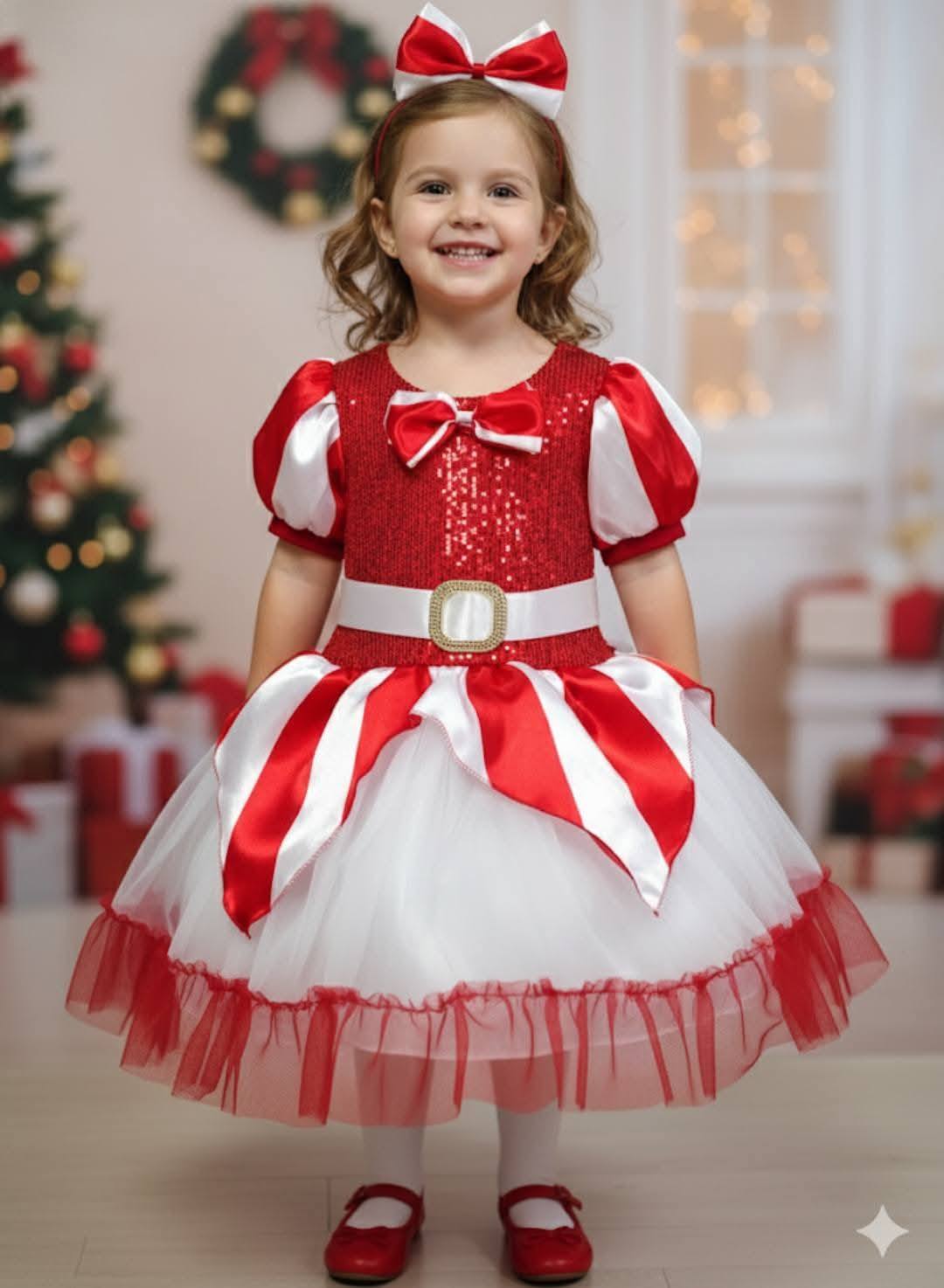 Este hermoso vestido Carmelo Navideño para niña combina tonos rojo y blanco inspirados en el clásico bastón de dulce. Su falda amplia de tul y sus detalles satinados crean un look festivo y encantador.