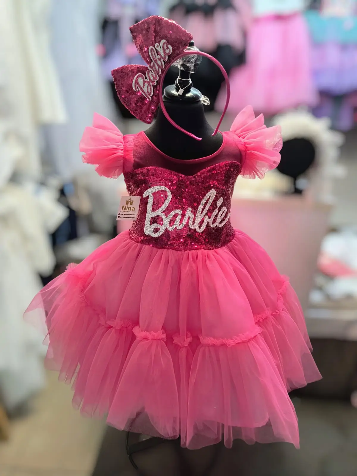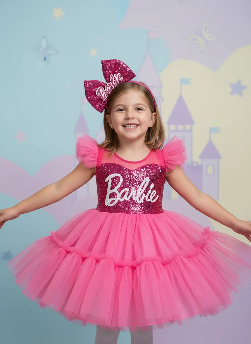 Vibrante vestido infantil en tono rosa fucsia, diseñado para las pequeñas fans de Barbie. Presenta un corpiño brillante cubierto de lentejuelas fucsias, destacando el icónico logo “Barbie” en lentejuela blanca brillante. El diseño incluye un cuello redondo con detalle de tela transparente y delicadas mangas abullonadas de tul. La falda, de estilo tutú, está compuesta por múltiples capas de suave tul rosa para un efecto voluminoso y divertido. Se complementa con una diadema a juego que lleva un gran lazo de lentejuelas fucsias y el logo “Barbie” en el centro, ideal para fiestas de cumpleaños, disfraces o cualquier ocasión especial.